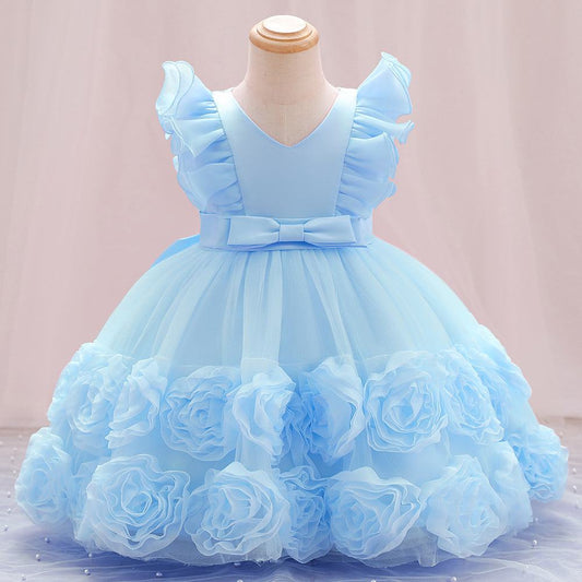 Girl's Rose Red Bridal Party Bow Trailing Princess Dress
